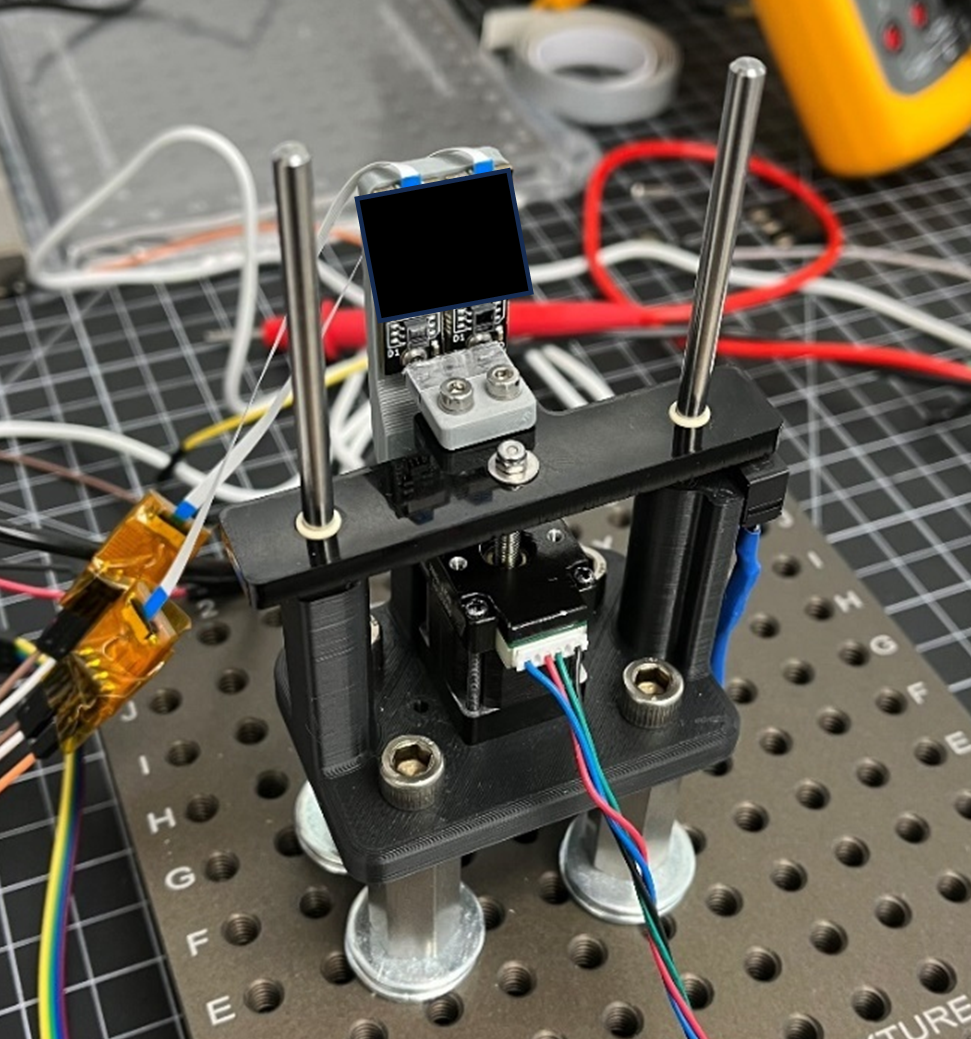 This test fixture was designed and built to verify that an optical limit sensor had a lifespan > 1 million triggers. The fixture carries out this test by oscillating between the optical limit sensor and the mechanical limit switch.